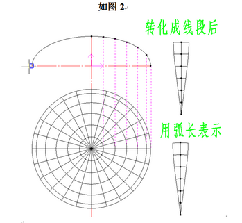 ⑸ 在所作的若干圓上截取相應(yīng)的同心圓弧的長度,為了下料方便,把弧長轉(zhuǎn)化成線段的長度,按順序分別添加到素線的等分點(diǎn)上,如圖2。